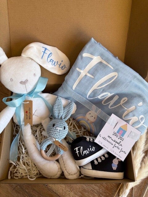 -mussola 70% cotone 30% bamboo 100x100 cm -peluche coniglio 30 cm -sonaglio coniglietto crochet -scarpine personallizate