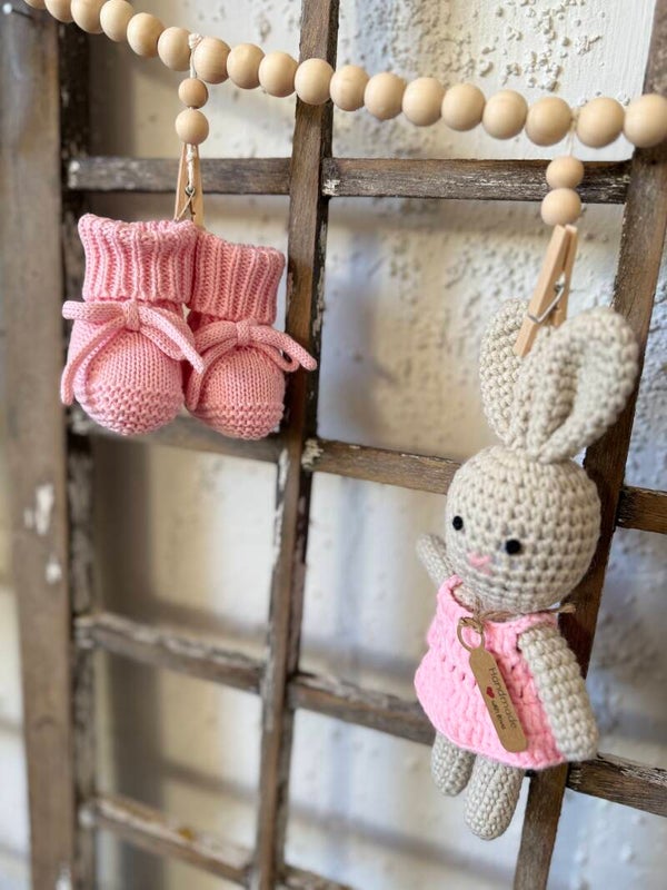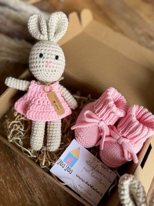 •Coniglietto lavorato a maglia, possibilità di ricamare l'iniziale sul vestitino.