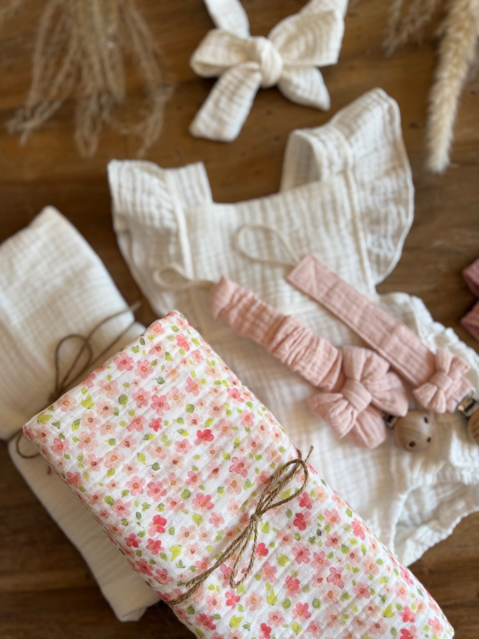 Pagliaccetto in mussola di cotone comprensivo di nastro per capelli.