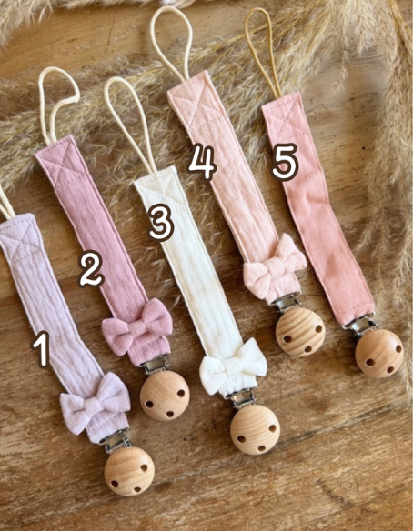 Catenella in mussola con fiocchetto e chiusura clip in legno di faccio.