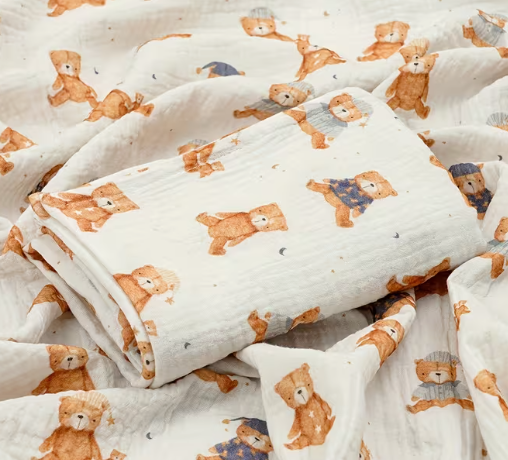 La mussola di cotone è il tessuto più amato dai neo-genitori per la sua incredibile versatilità e delicatezza. Realizzata con una trama piatta e aperta, è un tessuto estremamente traspirante, che permette alla pelle del neonato di respirare naturalmente, evitando surriscaldamenti.